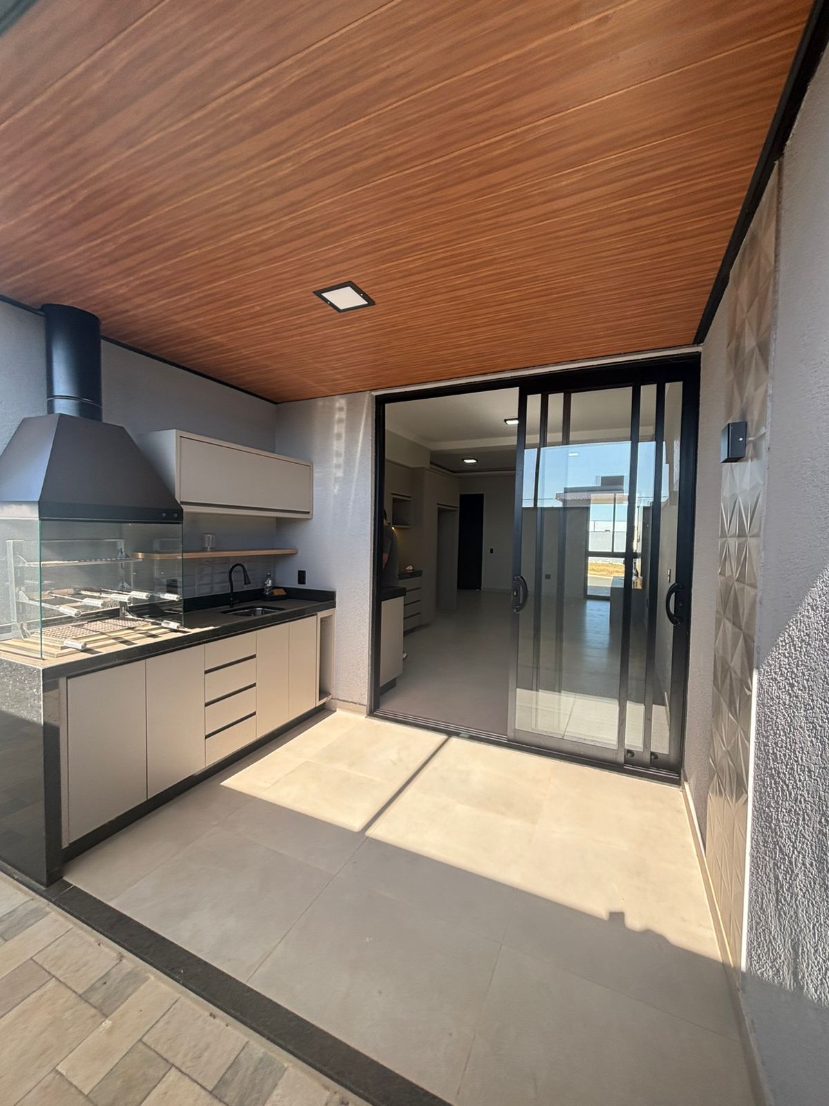Área gourmet separada com churrasqueira, pia e móveis planejados